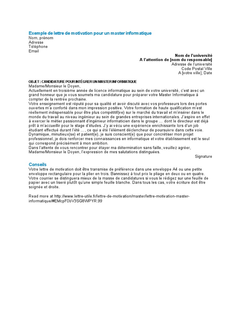 Exemple De Lettre De Motivation Pour Un Master Informatique Informatique Motivation